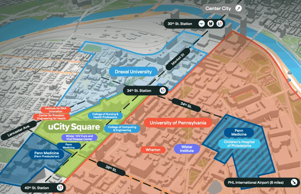 Located in Philadelphia’s University City neighborhood, uCity Square is a mixed-use community consisting of laboratory, clinical, academic, office, retail, and residential space. As Philadelphia’s central hub for medical and life science innovations, particularly in cell and gene therapy, uCity Square is connected to top-tier colleges and universities, independent research institutions, world-renowned hospitals, and is a center of connectivity for residents, students, professionals, and entrepreneurs alike.