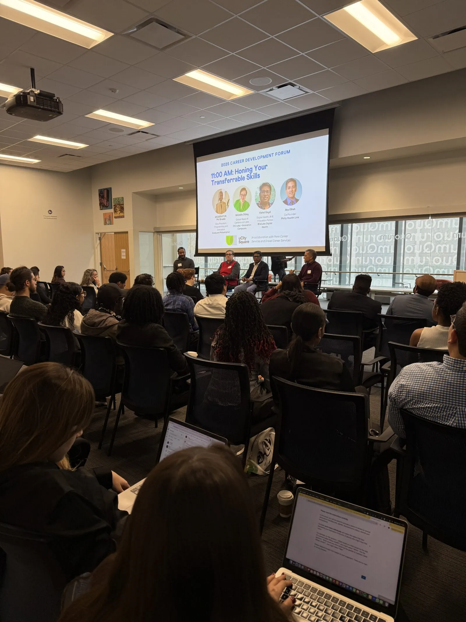 Over 80 students and young professionals gathered at uCity Square yesterday for an energizing afternoon at the inaugural Career Development Forum. The event featured networking opportunities, speed interviews, one-on-one resume reviews, and professional headshots, along with two standout panels: “Honing Your Transferable Skills,” included Phil Brooks (Graduate Philadelphia), Michelle Ottey (CIC), Vishal Goyal (BiteLabs), and Atul Shah (Philly Health Link); and “Cool Jobs in STEM and How to Get Them” featured Rachel Fong (Integral Molecular), Lindsay Fitzpatrick (Genuine Search Group), Ahmed Barakat (Monell Chemical Senses Center), and Michelle Cully (PA Dept. of Economic Development).